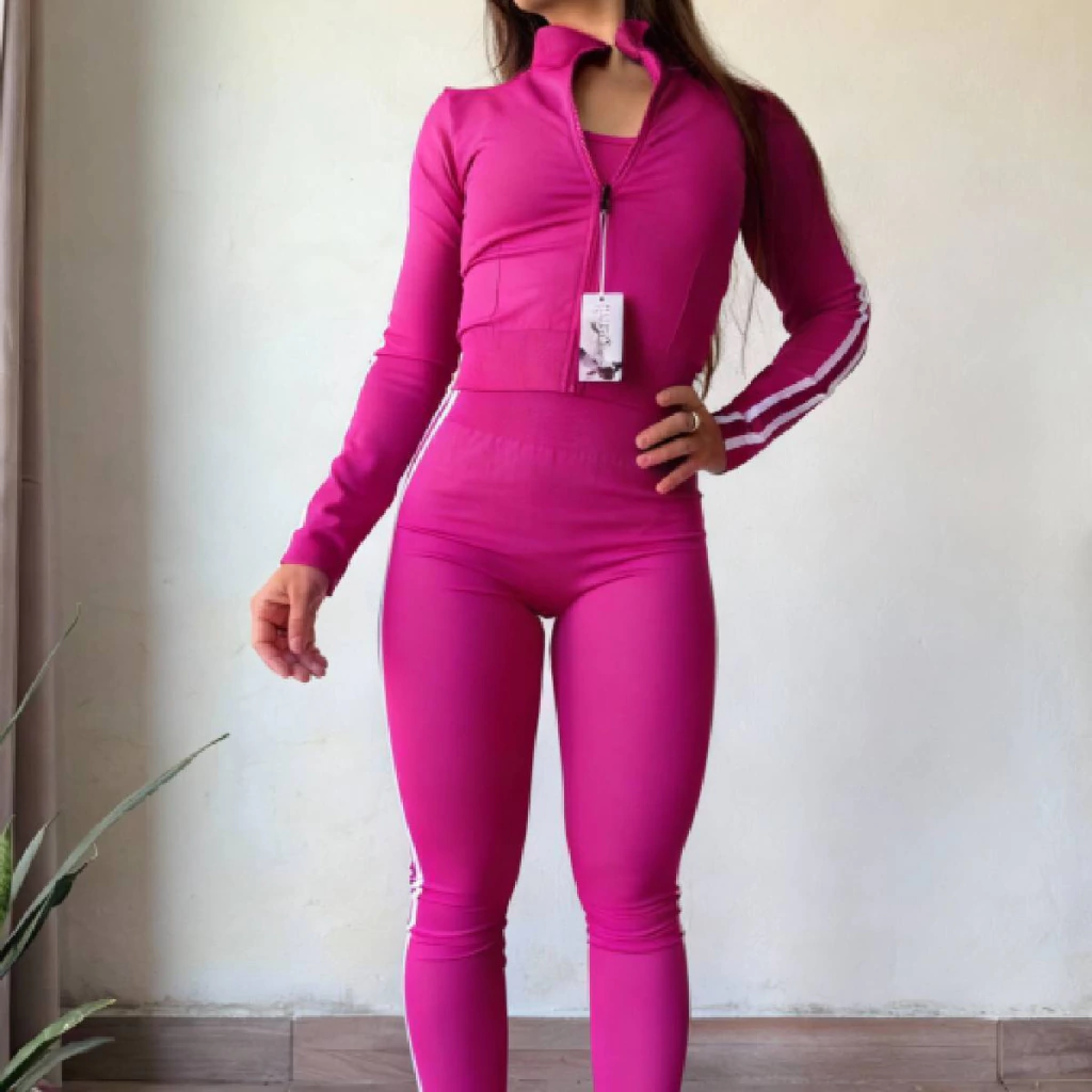 Descubrí el conjunto 2 piezas fucsia, (calza y campera), importado y diseñado para acompañarte en cada entrenamiento con estilo y comodidad. Confeccionado en 85% polyester y 15% spandex, este conjunto liso presenta elegantes detalles de líneas laterales que realzan tu figura. Ideal para quienes buscan un look deportivo que no sacrifica funcionalidad ni diseño. ¡Sentite cómoda, segura y lista para darlo todo en cada rutina!