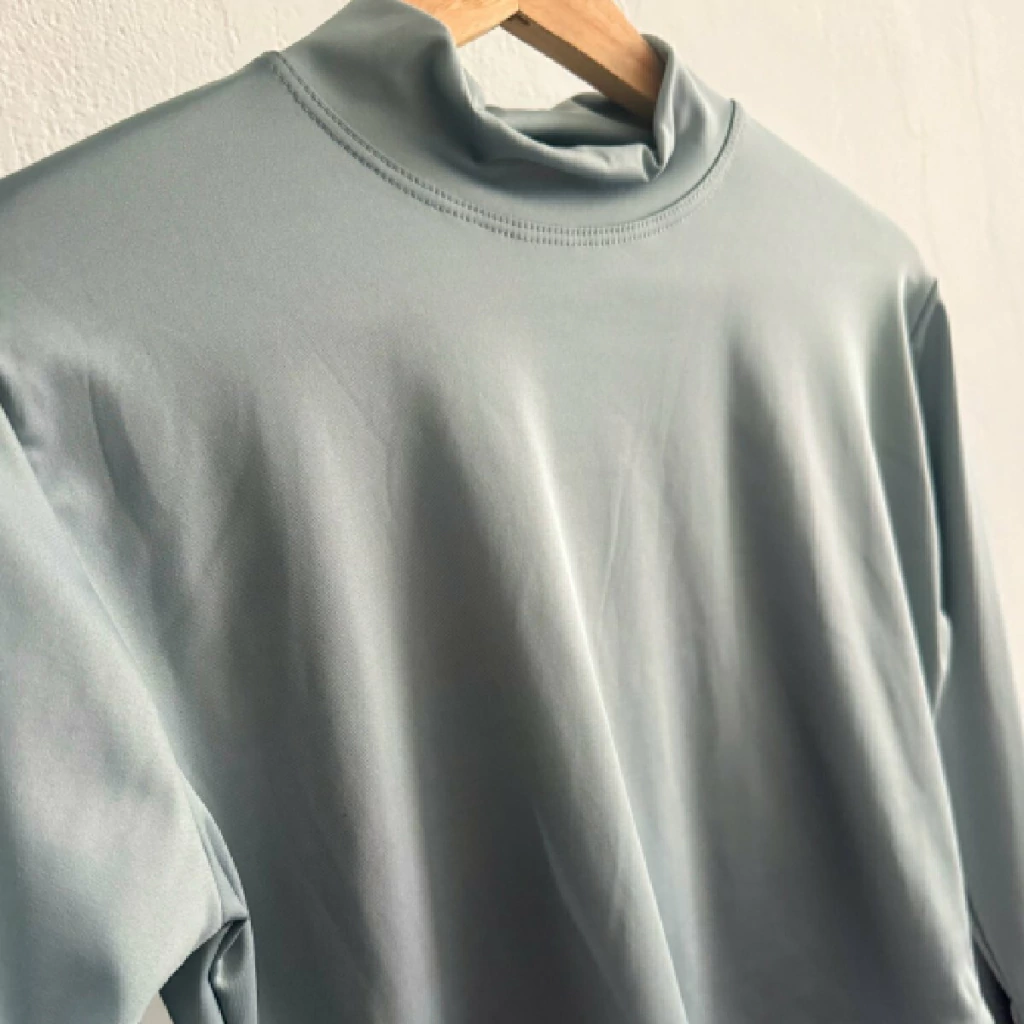 Remera gris confeccionada en lycra deportiva, con cuello alto y dedal en cada puño.